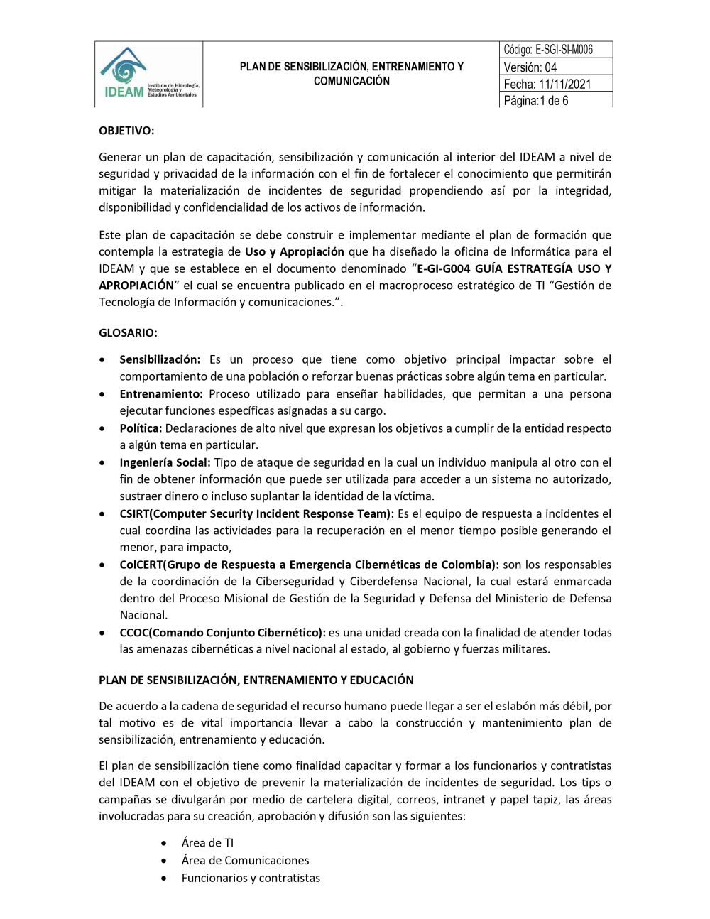 E-SGI-SI-M006 PLAN DE SENSIBILIZACIÓN, ENTRENAMIENTO Y COMUNICACIÓN V4