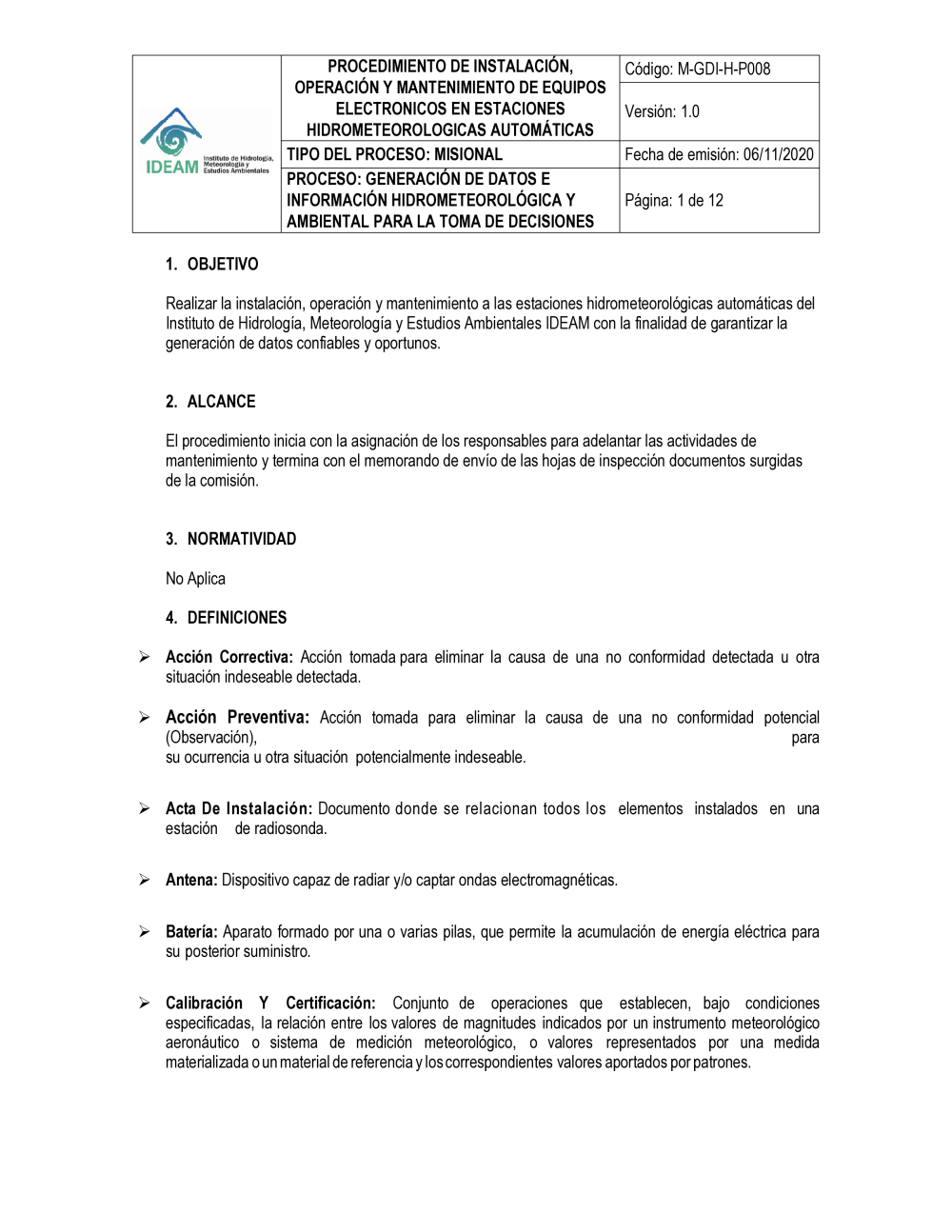 M-GDI-H-P008 PROCEDIMIENTO DE INSTALACIÓN, OPERACIÓN Y MANTENIMIENTO DE EQUIPOS ELECTRONICOS EN ESTACIONES HIDROMETEOROLOGICAS AUTOMÁTICAS v1.pdf